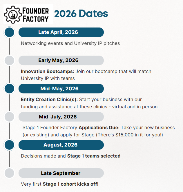 Founder Factory cohorts launch Spring of 2026. If you are a founder, researcher, or entrepreneur interested in participating, we encourage you to express interest to receive updates and application information.